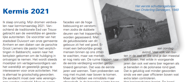 Ik slaap onrustig. Mijn dromen verdwalen naar kermismaandag 2021. Vanochtend de traditionele Eed van Trouw gebracht aan de wereldlijke en geestelijke autoriteiten. De voorzitter van het stadsdeel Duivoort van onze gemeente Arnhem en  een diaken van de parochie Groot Liemers (de pastor had verplichtingen in Babberich) waren naar het kerkplein gekomen om de huldiging in ontvangst te nemen.