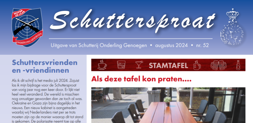 Als ik dit schrijf is het medio juli 2024. Zojuist las ik mijn bijdrage voor de Schuttersproat van vorig jaar nog een keer door. Er lijkt niet heel veel veranderd. De wereld is misschien nog onrustiger geworden dan ze toch al was. Oekraïne en Gaza zijn bijna dagelijks in het nieuws. Een nieuw kabinet is aangetreden waarbij wij Nederlanders niet per se trots moeten zijn op de manier waarop dit tot stand is gekomen. De polarisatie neemt toe op alle niveaus. In de wereld, in Nederland en ook lokaal merken we dat.