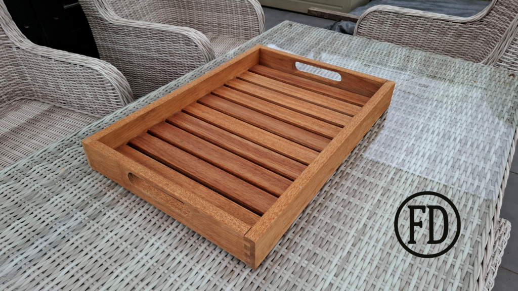 Mei 2025 – Op onze tuintafel stond al jaren een dienblad. Ooit eens gekocht bij een tuincentrum denk ik. Maar door de jaren heen was hij er niet mooier op geworden. Van een paar hardhouten planken van de bouwmarkt heb ik toen dit exemplaar gemaakt. Waarschijnlijk is het Merbau of Meranti, maar zeker ben ik daar niet van.