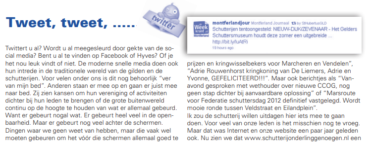 Twittert u al? Wordt u al meegesleurd door gekte van de social media? Bent u al te vinden op Facebook of Hyves? Of je het nou leuk vindt of niet. De moderne snelle media doen ook hun intrede in de traditionele wereld van de gilden en de schutterijen. Voor velen onder ons is dit nog behoorlijk “ver van mijn bed”.