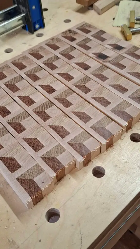 Nadat mijn eerst snijplank (eiken – end grain) best wel redelijk was gelukt, wilde ik meteen ook wel iets moeilijkers proberen. Het is deze snijplank geworden met 3D motief.