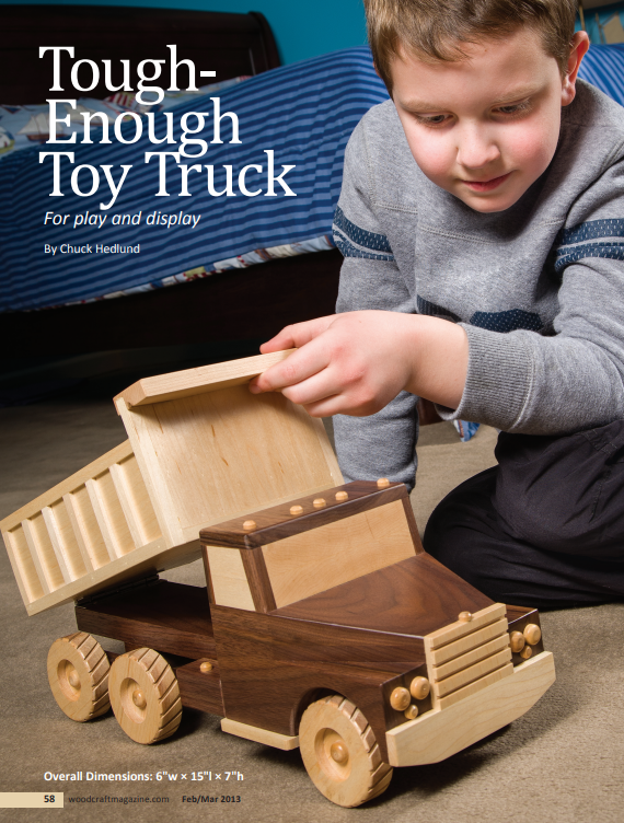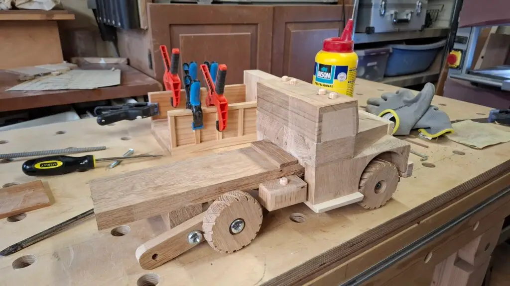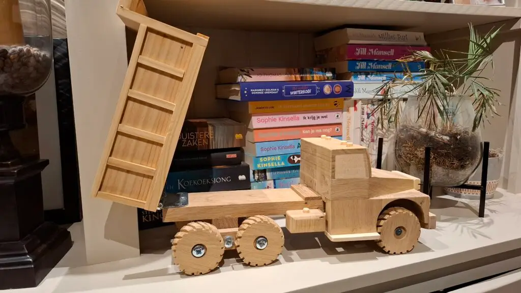 Deze vrachtwagen kwam een keer voorbij op facebook. En het mooie is dat er ook een werkbeschrijving verkrijgbaar was. Het originele model is gemaakt van noten en esdoorn (Walnut & maple). Uit kostenoverwegingen heb ik hier gebruik gemaakt van hout dat “er nog lag”.